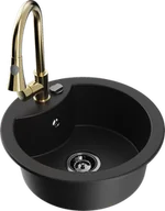 Mexen Pablo zlewozmywak granitowy 1-komorowy z ociekaczem i baterią kuchenną Savita, czarny/złoty metalik - 6510-75-672601-70-B