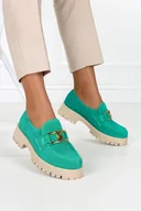 Zielone mokasyny skórzane damskie ze srebrną ozdobą na szerokim klocku PRODUKT POLSKI Casu 20175-38