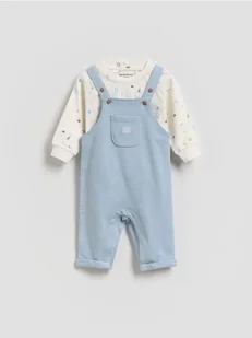 Komplet składający się z ogrodniczek i koszulki, wykonany z bawełnianej dzianiny.