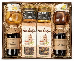 Elegancki zestaw prezentowy z herbatą i naturalnymi słodkościami. Uniwersalna propozycja na prezent dla każdego Oryginalny prezent w formie luksusowego kosza prezentowego z herbatą i słodkościami zaskoczy każdą obdarowaną osobę. Dzięki uniwersalnej zawartości można wręczyć go na dowolną okazję! W środku drewnianej skrzynki umieściliśmy aż dwa duże opakowania naszych aromatycznych herbat owocowych. Uzupełniliśmy je różnorodnymi dodatkami, z których można przygotowywać przepyszne herbaciane napary: dwa kremowane miody (z truskawką i z pomarańczą), dwa syropy (z rabarbaru i wiśniowy) oraz dwa słoiczki cytryn w syropie (z rumem i z żurawiną).