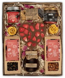 doskonała mieszanka herbaty owocowej w ozdobnym pudełku z różową etykietą (herbatę wybierają nasi specjaliści spośród bogatej oferty herbat z dodatkami). Krem czekoladowo-orzechowy Nocciolandia 40% Gourmet 200 g. Czekolada w kształcie serca 85 g z dodatkiem owoców liofilizowanych. Baton Miodowy Kłos z ciemną czekoladą 80 g. Miód kremowany z maliną 220 g.
