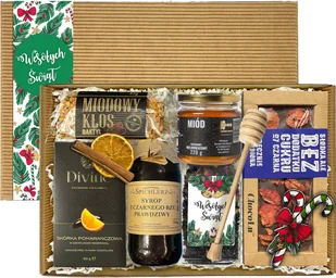 Duży zestaw prezentowy Prezent pod Choinkę Herbata Miód Czekolada Syrop box Ten wykwintny zestaw prezentowy to idealny wybór dla każdego, kto pragnie obdarować bliską osobę czymś niepowtarzalnym. Podaruj wyjątkowy, pełen emocji prezent, który pozostanie w pamięci na długo. W skład zestawu wchodzą: Herbata liściasta - 40g czarna z aromatycznymi dodatkami, z kolorową etykietą Skórka pomarańczowa w czekoladzie - 50g, które zaspokoją każde podniebienie Czekolada: 53g z liofilizowanymi owocami – tradycyjne smaki w nowoczesnym wydaniu Miód naturalny - 220g pełen naturalnej słodyczy.
