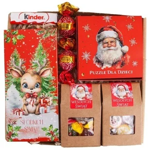 Świąteczny zestaw prezentowy dla dzieci – magiczny upominek pełen radości i słodkich niespodzianek! Szukasz wyjątkowego prezentu, który wywoła uśmiech na twarzy dziecka? Ten uroczy świąteczny box to doskonały wybór! W ozdobnym pudełku z okienkiem, przewiązanym delikatną wstążką, ukryto zestaw pysznych słodyczy oraz puzzle z motywem Mikołaja, które zapewnią kreatywną zabawę. To idealny prezent, który połączy świąteczną magię z dziecięcą radością – gotowy do wręczenia prosto pod choinkę. W skład zestawu wchodzi: Puzzle świąteczne (120 elementów) – kolorowa układanka z motywem Mikołaja w ozdobnym kartoniku, doskonała do wspólnego spędzania czasu. Czekolada mleczna z reniferem – klasyczna, świąteczna słodycz w czerwonym opakowaniu.
