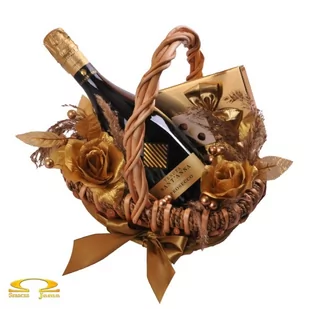 Drobny koszyk ze znakomitym winem musującym oraz belgijskimi czekoladkami- złoty środek w ślubnych prezentach między bukietem kwiatów a butelką wina pozbawioną dekoracji. Koszyk utrzymany w złocistej kolorystyce sprosta trudnemu zadaniu symbolicznego ale eleganckiego prezentu.