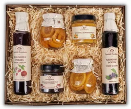 Prezent przychodzi gotowy do wręczenia. Do upominku można dołączyć kartkę z własnymi życzeniami (opcja dodatkowo płatna). Kosz box podarunkowy zawiera: Konfitura z pomarańczy 210 g naturalna konfitura z serii przetworów Ogródek Dziadunia. Konfitura z żurawiny 240 g naturalna konfitura z serii przetworów Ogródek Dziadunia.