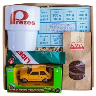 Zestaw prezentowy PRL – retro upominek z humorem i sentymentem Szukasz wyjątkowego prezentu dla fana stylu retro lub miłośnika historii PRL? Ten zestaw to doskonałe połączenie nostalgii i klasyki – przywołuje klimat minionej epoki, oferując jednocześnie nutę humoru i stylu. W środku znajdziesz kultowe dodatki z czasów PRL, a całość zapakowana jest w eleganckie pudełko z okienkiem, przewiązane wstążką i uzupełnione bilecikiem z życzeniami. Zawartość zestawu: Kubek ceramiczny z napisem Prezes – trwały nadruk w stylu retro Krem do golenia Lider – klasyczny produkt z czasów PRL Kartka żywnościowa – pamiątka nawiązująca do realiów zakupów sprzed lat Kawa z przydziału – świeżo palona, drobno mielona, w kraftowym opakowaniu Model samochodu z PRL – miniatura kultowego auta (Fiat 126p, Fiat 125, Syrena lub Wartburg, kolor losowy) Wymiary pudełka: ok. 20 × 20 × 10 cm Materiał: