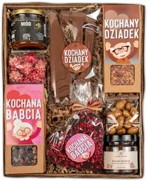 Czekolada mleczna w kształcie serca z etykietką Kochana Babcia 85 g z dodatkiem owoców liofilizowanych. Narzędzia z czekolady mlecznej z etykietką Kochany Dziadek 100 g. Maliny liofilizowane w białej czekoladzie Green Touch 50 g z rozbudowanej kolekcji słodyczy od Green Touch. Migdały w polewie z białej czekolady o smaku tiramisu Green Touch 50 g z rozbudowanej kolekcji słodyczy od Green Touch. Naturalny kosz z plecionki sosnowej (długość 35 cm, szerokość 25 cm, wysokość 10 cm).