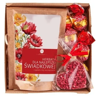 W skład zestawu wchodzą: Herbata czarna z pąkami róży (50g) – aromatyczny, rozgrzewający napar w kraftowym opakowaniu z kwiatową etykietą; niweluje zmęczenie i odpręża 3 szt. czekoladowych cukierków – w eleganckiej czerwono-złotej kolorystyce Ręcznie robione czekoladowe serduszko – z liofilizowanymi truskawkami Bilecik dwustronny z nadrukiem: Naturalna grafika z kwiatami na kraftowym tle Napis na froncie: "Z najlepszymi życzeniami" Miejsce na podpis Tekst życzeń: