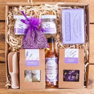 Naturalne marsylskie mydło w kostce lawendowe – mydło o delikatnych lawendowych nutach zapachowych, które oczyszcza skórę, jednocześnie relaksując zmysły i wprowadzając zapach Prowansji do Twojego dnia. Naturalne karmelki z lawendą – zdrowa, słodka przekąska zapakowana w eleganckie, kraftowe pudełeczko, idealna na chwilę przyjemności w towarzystwie aromatycznej herbaty. Naturalny syrop lawendowy Spichlerz (50ml) – słodki i aromatyczny syrop, który doskonale wzbogaca napoje oraz desery, a także wprowadza do codziennych chwil relaksu. Napar lawendowy – naturalny napar o uspokajającym działaniu, który pomoże w relaksacji, poprawiając jakość snu i wyciszając po ciężkim dniu. Woreczek z suszoną lawendą – naturalna lawenda, która może być używana jako odświeżacz powietrza lub ozdoba, wprowadzając do wnętrza zapach relaksu i harmonii.