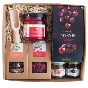 Ekologiczny miód z malinami to doskonałe źródło witamin i minerałów, a owocowe napary doskonale orzeźwiają i rozgrzewają, idealnie wspierając relaks. Konfitury z polskich owoców i wiśnie w deserowej czekoladzie to przepyszne, naturalne smakołyki, które będą idealnym uzupełnieniem każdego napoju lub deseru. Drewniany nabierak sprawia, że korzystanie z tych produktów to czysta przyjemność. Cechy produktu: Pudełko wykonane z grubej, sztywnej tektury o wymiarach ok.