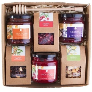 Opakowanie z okienkiem, z dopasowaną etykietą. Napar malinowy – rozgrzewający napój o intensywnym smaku malin, idealny na każdą porę roku, pełen aromatycznego zapachu. Miód polski z pomarańczą i imbirem (220g) – ekologiczny miód z polskiej pasieki, wzbogacony o naturalną pomarańczę i imbir, który doda energii i zdrowia. Miód polski z malinami (220g) – miód o naturalnej słodyczy z dodatkiem malin, który wprowadza w klimaty letnich dni. Miód polski z aronią (220g) – ekologiczny miód z dodatkiem aronii, pełen antyoksydantów i cennych właściwości zdrowotnych.