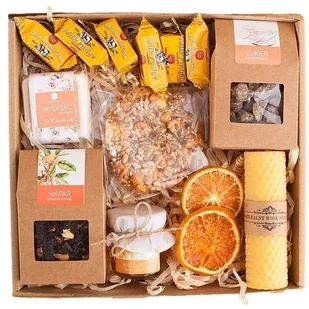Pomarańczowo-Miodowy Kosz Prezentowy – Naturalne Smakołyki i Relaks w Jednym Podaruj bliskim wyjątkowy zestaw prezentowy, pełen zdrowych i ekologicznych produktów. Ten pomarańczowo-miodowy kosz to doskonały wybór na każdą specjalną okazję – urodziny, imieniny, święta czy jako wyraz wdzięczności. Starannie zapakowany w kraftowe pudełko z okienkiem, przewiązany delikatną wstążką i ozdobiony bilecikiem, zestaw zachwyca swoją elegancją i naturalnością. Zawartość kosza: Świeca z naturalnego wosku pszczelego (10,5 cm) – ręcznie robiona, ekologiczna, idealna na chwile relaksu.