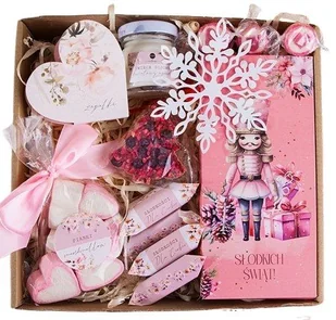 Jaki prezent dla kobiety na Święta Bożego Narodzenia? Wspaniałym wyborem będzie zestaw w ozdobnym opakowaniu prezentowym, w którym znalazły się słodkości, świeca sojowa, polskie krówki w eleganckich papierkach, a także pianki marshmallow. Pudełko przewiązane jest różową wstążką i posiada dołączony bilecik z życzeniami i miejscem na podpis. Opis: skład: kosz prezentowy świąteczny umieszczony w tekturowym pudełku z okienkiem, prezent przewiązany jest różową wstążką i sprzedawany z dołączonym, dwustronnym bilecikiem; wewnątrz kosza prezentowego na naturalnej wełnie drzewnej zostały umieszczone najwyższej jakości składniki: 1. czekolada mleczna w ozdobnym kartoniku w różowym kolorze z motywem świątecznym 2. 4szt. krówek śmietankowych zawiniętych w ozdobne papierki z motywem różowych kwiatów i napisem "Słodkości dla Ciebie" 3.