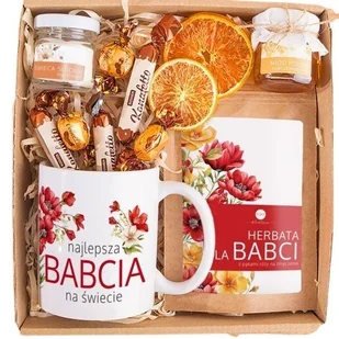 Prezent znajduje się w solidnym, tekturowym pudełku z przezroczystym okienkiem, przewiązanym delikatną wstążką. Do zestawu dołączony jest dwustronny bilecik z miejscem na osobiste życzenia. Całość ułożona jest na naturalnej wełnie drzewnej, na której spoczywają wysokiej jakości produkty: Kubek o pojemności 330 ml z trwałym nadrukiem kwiatowym i napisem „Najlepsza BABCIA na świecie”, bezpieczny do mycia w zmywarce Czarna herbata z pąkami róży (50 g) – intensywnie aromatyczny, rozgrzewający napar, który pomaga zwalczać zmęczenie; opakowana w kraftową torebkę z czerwonym kwiatowym motywem Polski miód wielokwiatowy (50 g) – naturalny i ekologiczny, pełen zdrowotnych właściwości i słodyczy 3 cukierki Konaffeto – delikatne słodkości, idealne na każdą okazję 3 cukierki Coffe Like – wyjątkowe pralinki z nutą kawy Ręcznie wykonana świeczka sojowa o zapachu wanilii (40 ml) – doskonała do tworzenia atmosfery relaksu 2 plasterki suszonej pomarańczy – dodające świeżego, cytrusowego aromatu Materiał opakowania: gruba, sztywna tektura Bilecik: