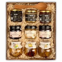 Do tego dodaliśmy trzy wyborne konfitury z żurawiny, płatków róży oraz pomarańczy. Całość uzupełniliśmy słodkimi owocami (pigwą i cytryną) w syropach z dodatkami. Dla wygody nabierania produktów dorzuciliśmy także łyżkę z drewna czereśniowego. Tak przygotowany zestaw podarunkowy zapakowaliśmy w uniwersalny sosnowy kosz podarunkowy wypełniony wełną drzewną. Całość dodatkowo zabezpieczyliśmy folią.