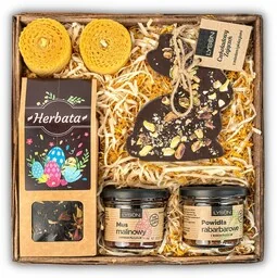 Wielkanocny koszyk prezentowy z przetworami, czekoladą, herbatą i świecami Idealny prezent z okazji świąt Wielkiej Nocy. Całość obsypana wewnątrz płatkami nagietka. Pudełko prezentowe zawiera: Wiosenna czarna herbata liściasta 60g w ozdobnym pudełku. Czekolada ciemna zajączek z pistacjami i miodem 85g.