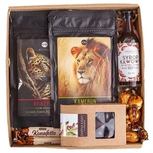 męski zestaw upominkowy Opakowanie: tekturowe pudełko z okienkiem, przewiązane delikatną wstążką Dodatki: dwustronny bilecik z miejscem na podpis i życzenia Zawartość zestawu (na naturalnej wełnie drzewnej): Kawa świeżo palona, drobno mielona z Brazylii – 50g (czarne opakowanie) Kawa świeżo palona, drobno mielona z Kamerunu – 50g (czarne opakowanie) Naturalny syrop kawowy Spichlerz – 50 ml Ziarna kawy w czekoladzie – w kraftowym pudełeczku z okienkiem 2 sztuki cukierków Konafetti 5 sztuk cukierków Coffee Like Bilecik: Grafika: kwiatowy motyw na kraftowym tle Napis: