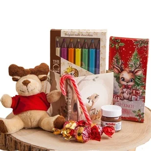Zawartość boxa: 7 czekoladowych kredek z belgijskiej mlecznej czekolady (100 g), mleczna czekolada w opakowaniu z reniferem, maskotka renifer, lizak w kształcie laski Mikołaja (losowy kolor), 2 czekoladowe cukierki w czerwonych papierkach, mini Nutella 25 g. Specyfikacja: opakowanie: pudełko kwadratowe z motywem leśnych zwierzątek, wymiary: