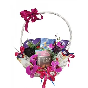 Zawartość kosza: Pralinki orzechowe Milka;I love Milka;165g Śliwka Nałęczowska;Solidarność;300g Czekolada Milka Peanut Carmel;mleczna z karmelem i orzeszkami ziemnymi;276g Ptasie Mleczko;E. Wedel;kokosowe;380g Trufle francuskie Mieszko;175g Herbata owocowa z żurawiną;Malwa;liściasta;50g Herbata owocowa z kwiatem hibiskusa;Malwa;liściasta 50g Herbara Sir Adalbert’ s Tea;czarna liściasta z jagodami;puszka 100g Herbata Sir Adalbert’ s Tea;czarna;liściasta o aromacie owoców tropikalnych;110g Sztuczne kwiaty Oferowane przez nas kosze mają podkład w postaci wełny drzewnej i są zapakowane w folię celofan oraz przyozdabiane wstążką;aby mogły stanowić gotowy upominek. Na powyższej fotografii przed zafoliowaniem (dla lepszego uwidocznienia zawartości).
