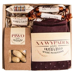 Stylowy zestaw prezentowy dla mężczyzny Szukasz drobnego, a jednocześnie eleganckiego i praktycznego upominku dla mężczyzny? Ten zestaw łączy wygodę, smak i nutę humoru, dzięki czemu idealnie sprawdzi się na każdą okazję. W ozdobnym pudełku z okienkiem, wyłożonym naturalną wełną drzewną, znajdziesz bawełniane skarpety w zabawnym opakowaniu, chrupiące fistaszki w kraftowym pudełeczku z dowcipną etykietą oraz słodkie dodatki. Całość przewiązana jest delikatną wstążką i dołączony jest dwustronny bilecik z nadrukiem „Z najlepszymi życzeniami” oraz gotowym tekstem: By każdy dzień przynosił radość i spełnienie, by zdrowie i szczęście zawsze towarzyszyły, a marzenia, nawet te najskrytsze się spełniały. Skład zestawu: