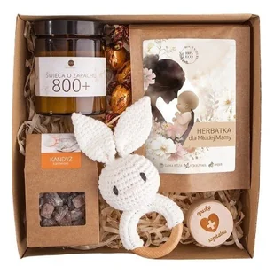 Zestaw prezentowy dla Młodej Mamy – relaks, czułość i odrobina słodyczy Wyjątkowy box stworzony z myślą o świeżo upieczonej mamie, która zasługuje na chwilę odpoczynku i uśmiechu w nowym etapie życia. W środku znajdują się starannie dobrane produkty – aromatyczna herbatka, relaksująca świeca o zapachu „800+”, słodkie dodatki i uroczy gryzaczek dla maluszka. Całość zapakowana w estetyczne pudełko z okienkiem i wstążką, gotowa do wręczenia bez dodatkowego pakowania – idealny prezent na narodziny dziecka lub Baby Shower. Zawartość zestawu: Herbatka dla Młodej Mamy w kraftowym opakowaniu z elegancką etykietą – 5 saszetek ekologicznej herbaty ziołowo-owocowej, idealnej na chwilę relaksu.