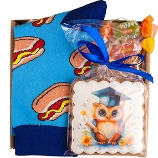 W skład zestawu wchodzą: Aromatyczny piernik z motywem sowy (50 g) – ozdobnie dekorowany, zapakowany w celofanowy woreczek przewiązany wstążeczką. Kolorowe skarpety z zabawnymi wzorami – rozmiar uniwersalny (43–46), 10 różnych wzorów wysyłanych losowo. Owocowe galaretki – 2 sztuki – słodki dodatek dopełniający zestaw. Dodatkowe informacje: