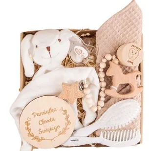 Rośnij w zdrowiu i szczęściu. " Wymiary pudełka: ok. 20 × 20 × 10 cm Dlaczego warto wybrać ten prezent? Gotowy do wręczenia – elegancko zapakowany z bilecikiem i wstążką. Połączenie praktycznych elementów i pamiątek o symbolicznym znaczeniu. Uniwersalny – odpowiedni zarówno dla dziewczynki, jak i chłopca.