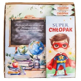 Zestaw prezentowy „Super Chłopak” – słodka i praktyczna niespodzianka na Dzień Chłopaka Ten wyjątkowy zestaw to połączenie słodkości i praktycznych dodatków, zamknięte w eleganckim pudełku z okienkiem i przewiązane ozdobną wstążką. W środku czeka mleczna czekolada z miejscem na osobiste życzenia, krówki w superbohaterskiej oprawie oraz kolorowy notes, który doskonale sprawdzi się podczas szkolnych dni. To prezent, który nie tylko umili czas, ale też podkreśli, że każdy chłopak może poczuć się jak prawdziwy bohater. Opis zestawu: notes z kolorową grafiką, 32 kartki w kratkę czekolada mleczna w pudełku z motywem superbohatera i napisem „Super Chłopak” – z miejscem na podpis i życzenia 2 szt.