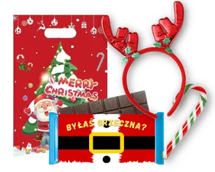 Piękny prezent na Święta i Mikołajki . W zestawie znajduje się opaska rogi renifera, czekolada "Byłaś Grzeczna?", lizak laska oraz woreczek na prezenty. Otrz...