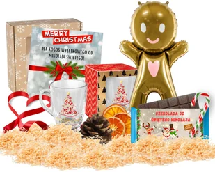 Pięknie zapakowany prezent na Mikołajki i Święta W zestawie znajduje się kubek szklany, czekolada świąteczna, balon foliowy Ciastek, lizak laska Mikołaja, sz...