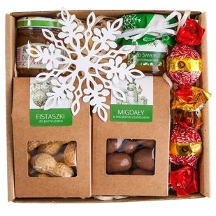 Idealny jako drobny, a zarazem elegancki prezent dla bliskiej osoby, współpracownika czy nauczyciela. W skład zestawu wchodzą: Miodek świąteczny – z zieloną etykietą i materiałowym kapturkiem Konfitura owocowa (40 g) – wysyłana w losowym smaku polskich owoców Migdały w belgijskiej czekoladzie – w kraftowym pudełku z etykietą Zielonych Świąt Fistaszki – w kraftowym pudełku z etykietą Zielonych Świąt Dwa czekoladowe cukierki w złoto-czerwonych papierkach Dekoracja świąteczna Opakowanie: gruba, sztywna tektura Bilecik: świąteczna grafika, napis "Wesołych Świąt", miejsce na podpis oraz gotowe życzenia: