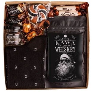 Praktyczny i stylowy prezent świąteczny dla mężczyzny Zestaw, który łączy komfort z przyjemnością – idealny na chłodne zimowe dni. W składzie znajdują się ciepłe, wysokiej jakości skarpety, aromatyczna kawa oraz słodycze o wyjątkowym smaku. To doskonały upominek, który umili wieczory, wprowadzi świąteczny nastrój i doda energii na cały dzień. Zawartość zestawu: 2 sztuki cukierków - aktualnie wysyłamy cukierki Coffee Like 2 sztuki cukierków Coffe Like Karmelki, zapakowane w elegancki, szklany słoiczek z ozdobną etykietą Ręcznie robiony lizak kręcony Para czarnych, eleganckich skarpet wykonanych z wysokogatunkowej bawełny 2 sztuki cukierków Konaffeto Aromatyczna, drobno mielona kawa świeżo palona, opakowana w czarne, świąteczne opakowanie Opakowanie: