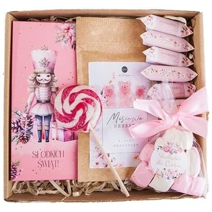 Świąteczny box prezentowy dla dziewczynki – gotowy zestaw słodkości Gotowy do wręczenia box świąteczny w eleganckim pudełku z okienkiem, przewiązanym różową wstążką, to doskonały pomysł na prezent pod choinkę lub na Mikołajki. Zestaw łączy w sobie słodycze, kolorowe dodatki oraz piękną oprawę graficzną, dzięki czemu wywoła uśmiech i stworzy magiczny, świąteczny klimat. Dołączony dwustronny bilecik z życzeniami sprawia, że prezent jest kompletny i nie wymaga dodatkowego pakowania. Zawartość boxa: zdrowa misiowa herbatka przygotowana z naturalnego soku owocowego, 6 śmietankowych krówek w różowych, świątecznych papierkach, mleczna czekolada w różowym opakowaniu ze świątecznym motywem, pianki marshmallow w celofanowym woreczku, kręcony lizak w różowym kolorze, bilecik dwustronny z grafiką i życzeniami „Wesołych Świąt”.