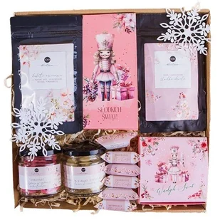 herbata czarna z pąkami róż umieszczona w czarnym opakowaniu 50g 3. 6szt. krówki o śmietankowym smaku zawinięte w ozdobne papierki z motywem różowych kwiatów 4. czekolada mleczna w ozdobnym pudełeczku z motywem świątecznym w różowej kolorystyce 5. migdały w białej czekoladzie z pudrem malinowym umieszczone w szklanym słoiku z czarną nakrętką 6. naturalne karmelkami z płatkami róży w szklanym słoiczku z etykietą różowych kwiatów 7.