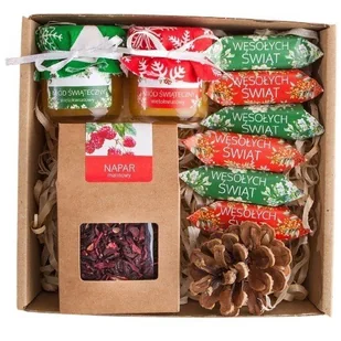 gruba, sztywna tektura Bilecik: świąteczna grafika, dwustronny, z napisem „Wesołych Świąt”, miejscem na podpis i gotowymi życzeniami: „Najpiękniejszych Świąt Bożego Narodzenia, przepełnionych aromatem piernika, cynamonu, gałązkami świerku, pełnych miłości, szczęścia i radości oraz samych wspaniałych chwil w Nowym Roku!” Wymiary pudełka: ok. 15 cm x 15 cm x 5 cm To drobny, ale elegancki upominek, idealny dla osób, które cenią jakość, prostotę i świąteczny klimat zaklęty w naturalnych smakach. Dlaczego warto wybrać ten kosz prezentowy? To gotowy upominek świąteczny – estetyczny i pełen wyjątkowych smaków Zawiera naturalne składniki wysokiej jakości Połączenie elegancji z autentycznym, domowym charakterem Idealny prezent zarówno prywatnie, jak i biznesowo Tworzy ciepły, aromatyczny nastrój świąt – przy herbacie, świecy i domowych smakołykach Pakowanie na prezent! Każdy zestaw jest starannie przygotowany do wręczenia – przewiązany elegancką wstążką i ozdobiony bilecikiem z pięknymi życzeniami.
