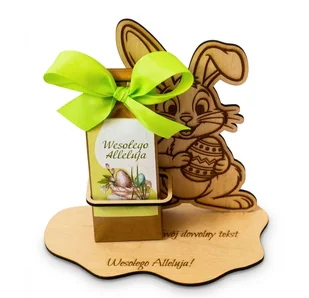 Po wypiciu zawartości zestawu, drewniana forma pozostanie piękną ozdobą wielkanocnego stołu na wiele kolejnych lat. Aromatyczne wnętrze – chwila relaksu w eleganckiej oprawie Tuż obok radosnego zajączka znajduje się estetyczne pudełeczko, kryjące w sobie aromatyczną kawę lub najwyższej jakości herbatę – wybór należy do Ciebie. Opakowanie zdobi przepiękna, wiosenna etykieta z motywem gniazdka i napisem "Wesołego Alleluja". Całość wieńczy okazała, soczyście zielona kokarda z grubej wstążki, która natychmiast przyciąga wzrok i nadaje upominkowi niezwykle radosnego, ekskluzywnego charakteru. Twój osobisty akcent – grawerowana dedykacja To, co czyni ten prezent absolutnie niepowtarzalnym, to możliwość jego pełnej personalizacji.