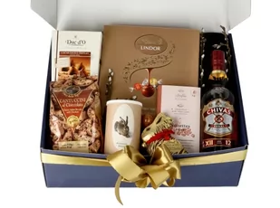 Eleganckie granatowe pudełko, które wraz ze świetnie dobranym asortymentem doskonale sprawdzi się w roli świątecznego prezentu. Mocny akcent kompozycji stanowi dwunastoletnia, szkocka whisky o bursztynowo-złotej barwie. Towarzyszą jej słodycze z przebijającym się motywem kakao oraz czekolady i specjalna kompozycja herbaty wielkanocnej. To doskonała propozycja dla osób ceniących klasyczne smaki z nutą szaleństwa!