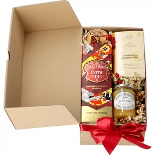 Zestaw w pudełku z tektury z elementami świątecznej czerwieni. Whisky z bogatymi nutami waniliowego karmelu i pikantnego cynamonu oraz karmelki z solą i czekolada. Całość dopełnia masło cytrynowe, które równoważy słodycz podgrzanego cukru.