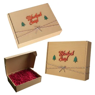 Wypełnienie jest już w zestawie. Czy dekor jest przyklejony na stałe? Tak, drewniane choinki i napis są solidnie zamocowany na wieczku. Czy można zamówić inne wzory? W tej wersji dostępny jest ten konkretnie Czy pudełko nadaje się do wysyłki? Tak, dzięki 4-warstwowej konstrukcji i wytrzymałej tekturze może bezpiecznie chronić zawartość również w transporcie. To coś więcej niż opakowanie – to część świątecznego prezentu. Zadbaj, by Twoje upominki wyglądały wyjątkowo pod choinką! Ręcznie dopracowane detale Każde pudełko zostało przygotowane z dbałością o estetykę, wygodę użytkowania i świąteczny klimat.