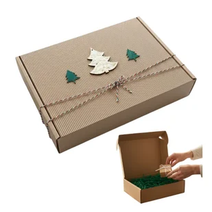 Świąteczne pudełko prezentowe z drewnianymi ozdobami w kształcie choinek, sznurkiem plecionym w świątecznych barwach w środku wypełniacz w kolorze zielonym Podaruj wyjątkowy prezent w wyjątkowym opakowaniu! Eleganckie, ekologiczne pudełko prezentowe świąteczne Handmade- to idealny sposób, by nadać świątecznym upominkom wyjątkowego charakteru. Starannie wykonane z 4-warstwowego kartonu fasonowego o wysokiej gramaturze, łączy w sobie trwałość, estetykę i ciepły, naturalny wygląd. Opis produktu Każdy szczegół tego pudełka został dopracowany z myślą o magii Świąt Bożego Narodzenia. Na pokrywie umieszczone są drewniane choinki w kolorze zielonym i naturalnym, które dodają elegancji i subtelnie nawiązuje do świątecznych dekoracji. Wnętrze wypełnione jest wypełniaczem w kolorze głębokiej zieleni, która pięknie eksponuje zawartość i chroni delikatne upominki.