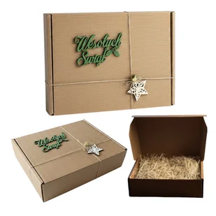 Wełna drzewna jest już w zestawie. Czy napis jest przyklejony na stałe? Tak, drewniany napis „Wesołych Świąt” jest solidnie zamocowany na wieczku. Czy można zamówić inne kolory napisu? W tej wersji dostępny jest napis zielony Czy pudełko nadaje się do wysyłki? Tak, dzięki 4-warstwowej konstrukcji i wytrzymałej tekturze może bezpiecznie chronić zawartość również w transporcie. To coś więcej niż opakowanie – to część świątecznego prezentu. Zadbaj, by Twoje upominki wyglądały wyjątkowo pod choinką! Ręcznie dopracowane detale Każde pudełko zostało przygotowane z dbałością o estetykę, wygodę użytkowania i świąteczny klimat.