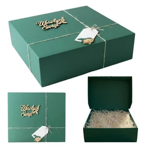 fasonowe Zastosowanie: opakowanie prezentowe, e-commerce, zestawy świąteczne Wyposażenie: • drewniany napis Wesołych Świąt (złoty kolor) • drewniana zawieszka z dzwonkami i motywem ostrokrzewu • jutowy sznurek dekoracyjny • wypełnienie wełna drzewna Opis produktu: Zanurz się w świątecznym klimacie z eleganckim pudełkiem prezentowym w kolorze butelkowej zieleni. To wyjątkowe opakowanie zachwyca nie tylko jakością wykonania, ale i detalami, które dodają mu magicznego uroku.