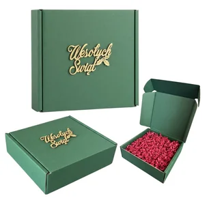 ? Świąteczne pudełko prezentowe z drewnianym napisem „Wesołych Świąt” i ostrokrzewem ? Estetyczne i solidne pudełko prezentowe w kolorze butelkowej zieleni, ...