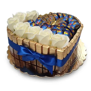 Słodki prezent w kształcie serca z cukierkami Wawel Tiki Taki, Merci i różami mydlanymi. Tort