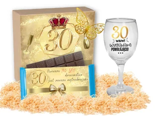 Piękny Prezent na 30 Urodziny! W zestawie znajduje się kieliszek do wina, czekolada, kartka z życzeniami, złoty motylek oraz czerwona wstążka. Całość zapakow...