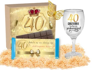 Piękny Prezent na 40 Urodziny! W zestawie znajduje się kieliszek do wina, czekolada, kartka z życzeniami, złoty motylek oraz czerwona wstążka. Całość zapakow...