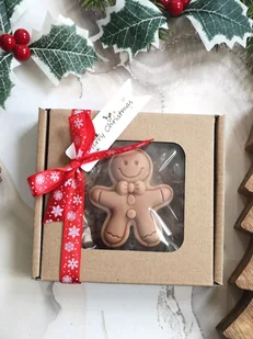 Świąteczny Box Prezentowy z mydełkiem Ciastkiem upominek podziękowanie Elegancki box z okienkiem o wymiarach 11 x 11 x 2 cm kryje w sobie urocze, ręcznie robione mydełko w kształcie Piernikowego Ludzika (ok. 6,5 x 6 cm). To praktyczny i efektowny drobiazg. Specyfikacja: oferta dotyczy 1 szt. mydełka w boxie z okienkiem wzór: