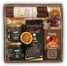 Miód wielokwiatowy 220 g. Miód kremowany z kakao 220 g. Naturalny kosz z plecionki sosnowej (długość 25 cm, szerokość 25 cm, wysokość 10 cm). Ozdoby w postaci suszonych plastrów pomarańczy i lasek cynamonu. Wypełnienie w postaci wełny drzewnej.