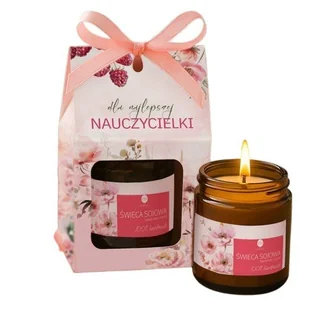 Naturalna świeca ręcznie robiona z wosku sojowego, zamknięta w eleganckim opakowaniu z dedykacją. Delikatny, kwiatowy zapach róży otula wnętrze i koi zmysły – idealny prezent na Dzień Nauczyciela lub zakończenie roku szkolnego. Opis: skład: naturalna ręcznie robiona świeca sojowa zamknięta w szklanym słoiczku w brązowym kolorze i z dopasowaną nakrętką, świeca posiada wspaniały kwiatowy aromat; na słoiczku znajduje się specjalna naklejka z dopasowaną grafiką oraz nazwą świecy; wysoka jakość świec - 100% handmade, wyprodukowane w Polsce z naturalnego wosku sojowego i naturalnych olejków eterycznych; świeca sprzedawana jest w komplecie ze specjalnie przygotowanym przepięknym opakowaniem z autorską grafiką oraz dedykacją dla Nauczycielki nadruk: grafika w odcieniach różu, dedykacja dla Nauczycielki na pudełku tak pięknie podany upominek dla Nauczycielki będzie wspaniałym wyborem, by podarować jej chwilę dla siebie Jak poprawnie palić świecę: Pierwsze palenie świecy powinno trwać do 3 godzin.
