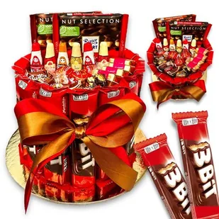 Zestaw prezentowy – Słodka Uczta Wyjątkowy zestaw prezentowy w kształcie słodkiego tortu wykonanego ręcznie z niebywałą starannością i dokładnością, tak aby mógł zaskoczyć i zachwycić osobę, którą chcemy obdarować. Tort zawiera wysokiej jakości batoniki, czekoladki i pralinki. Całość zapakowana jest w folię (celofan) i przewiązana okazałą kokardą dobraną kolorystycznie do zawartości. Jest gotowy do wręczenia. Idealny na prezent z różnych okazji.